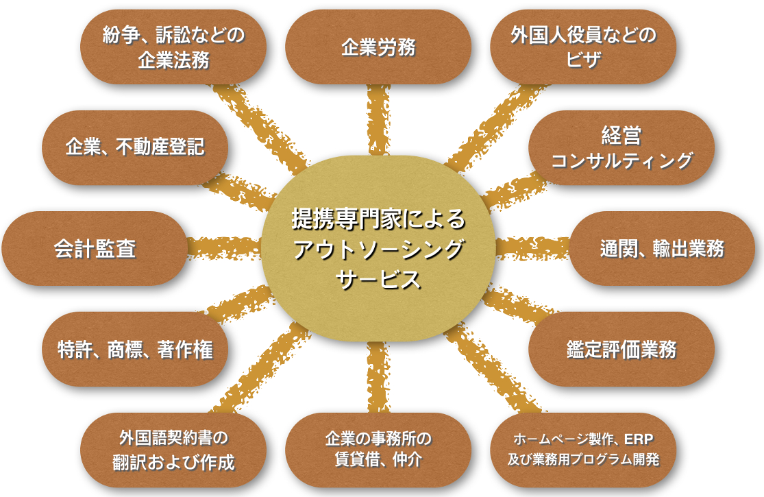 “企業業務に関する専門家グループとの提携によるワンストップ・サービスを提供いたします。”